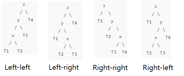 첫번째 위치는 y를 의미하고 두번째 위치는 x를 의미한다. y를 찾는 방법은 z의 balance factor를 조사하여 y를 결정하고 x는 y의 balance factor를 조사하여 0보다 크다면 왼쪽을 택하고 0보다 작거나 같으면 오른쪽을 택하면 된다. w가 삽입된 트리가 더 무겁기 때문이다.