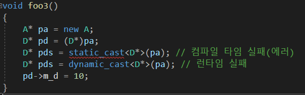 이전 포스트 예제에서 다운 캐스팅은 금지되지만 C 스타일 명시적 변환은 허용하고 있다. C++에서는 static_cast가 컴파일 타임에 이를 금지한다.