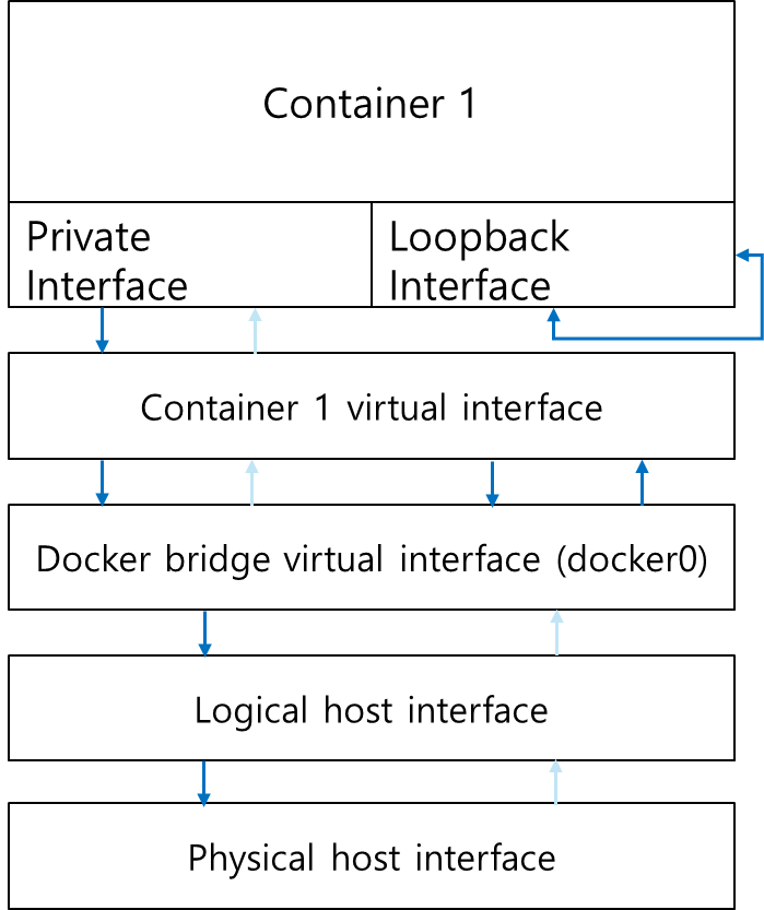각 컨테이너는 개인 loopback 주소와 각 컨테이너마다 할당된 네트워크와 연결되어 있는 ethernet 인터페이스를 갖는다.
