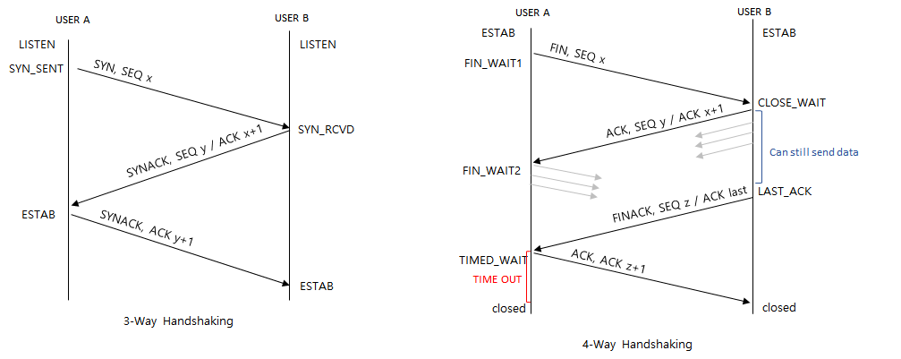 - A : SYN bit = 1, SEQn = x 인 패킷 전송 ---> 연결 요청 상태 (SYN_SENT)