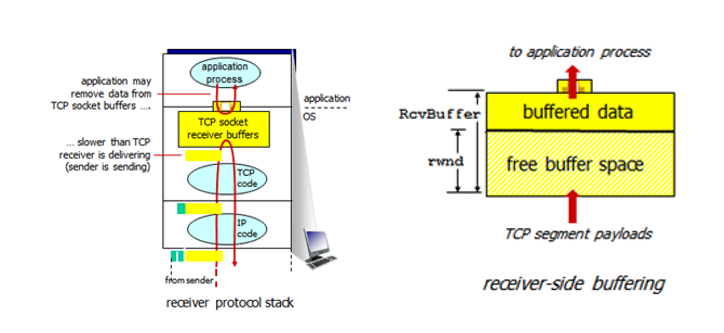 이 흐름을 제어하기 위해 수신자는 TCP 헤더에 "Window Size" 항목에 자신의 수신 버퍼의 남아 있는 크기(rwnd)를 담아 전송한다. 송신자는 ACK 패킷에 기록된 Window Size를 보고 다음 보내는 패킷의 데이터 크기를 이 Window Size를 넘지 않도록 제한한다.